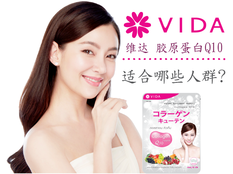 【泰国Vida胶原蛋白】Vida Collagen Q10 粒状泰国保健品,含有胶原三肽主要成分,优质胶原三肽和辅酶Q10来自日本。高质量天然提取物源于水果蔬菜分别为维生素C、α-硫辛酸、锌氨基酸螯合物、石榴提取物、荔枝核提取物、橙提取物、针叶樱桃提取物、番茄提取物、松树皮提取物、葡萄籽提取物、维生素E,共超过14种。适合想让肌肤从内到外美白的女性至身边的人注意到变化。